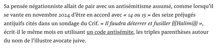 Dans une enquête de Mediapart sur ses messages antisémites et négationnistes publiés sur le réseau social X par Quentin Deranque : Sa pensée négationniste allait de pair avec un antisémitisme assumé, comme lorsqu’il se vante en novembre 2024 d’être en accord avec « 14 ou 15 » des seize préjugés antijuifs cités dans un sondage du Crif. « Il faudra déterrer et fusiller (((Halimi))) », écrit-il le même mois en utilisant un code antisémite, les triples parenthèses autour du nom de l’illustre avocate juive.